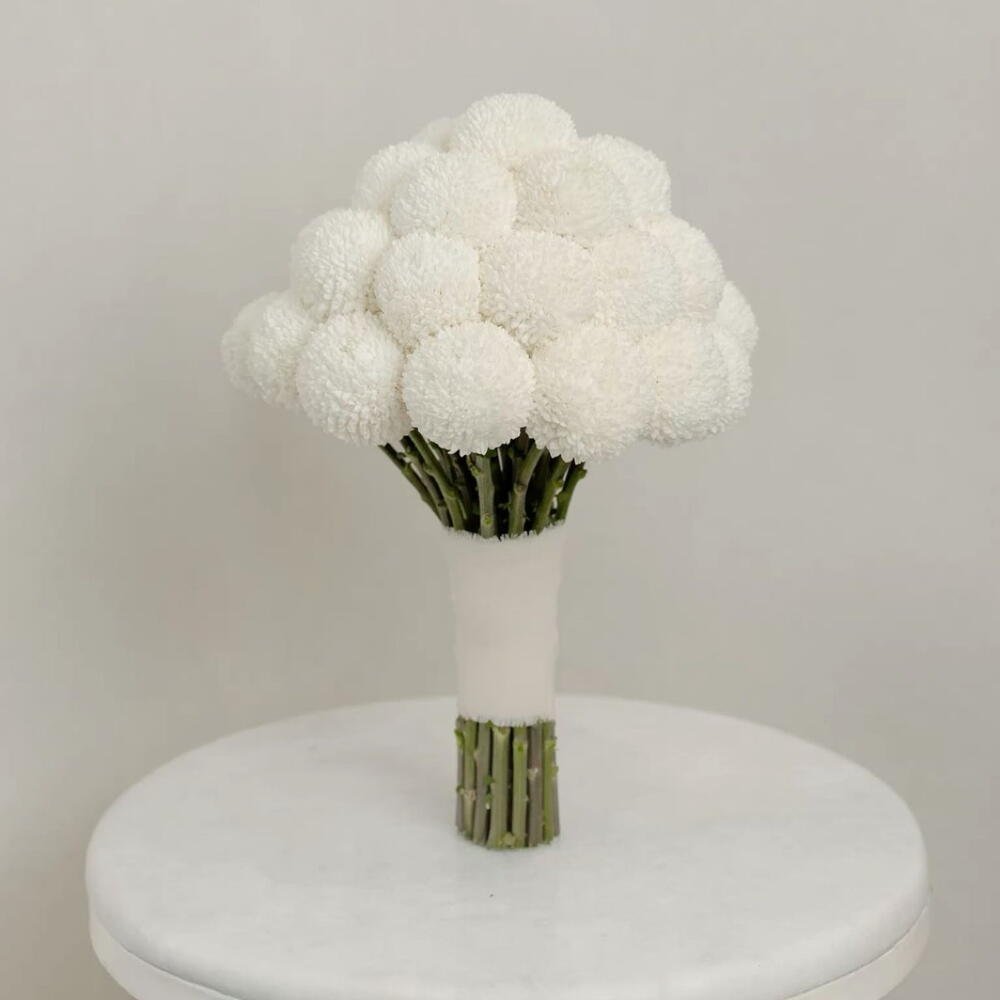 Celebrate purity and elegance with this beautiful bouquet of 20 white chrysanthemum pompoms, hand-tied to perfection for a fresh, charming, and sophisticated look. Each chrysanthemum is carefully selected for its fullness and freshness, creating a large, elegant bouquet perfect for weddings, bridal events, or special romantic occasions.