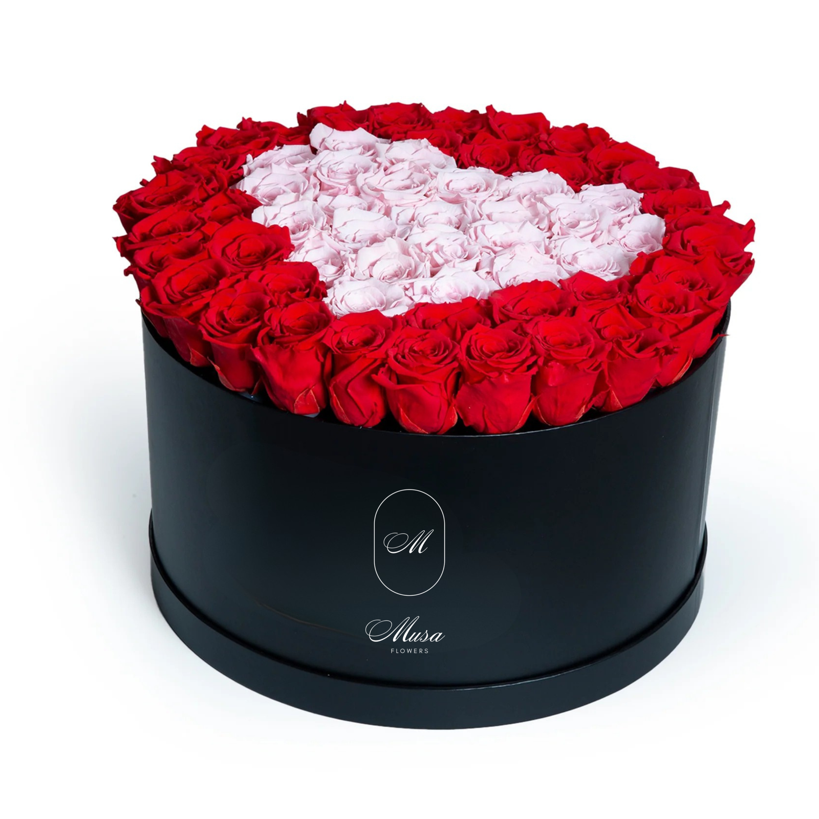 A breathtaking symbol of love and devotion, this arrangement features luxurious red roses surrounding a delicate pink rose inner heart, forming a striking heart-within-a-heart design. The vibrant reds and soft pinks create a romantic contrast that is visually captivating and emotionally meaningful.