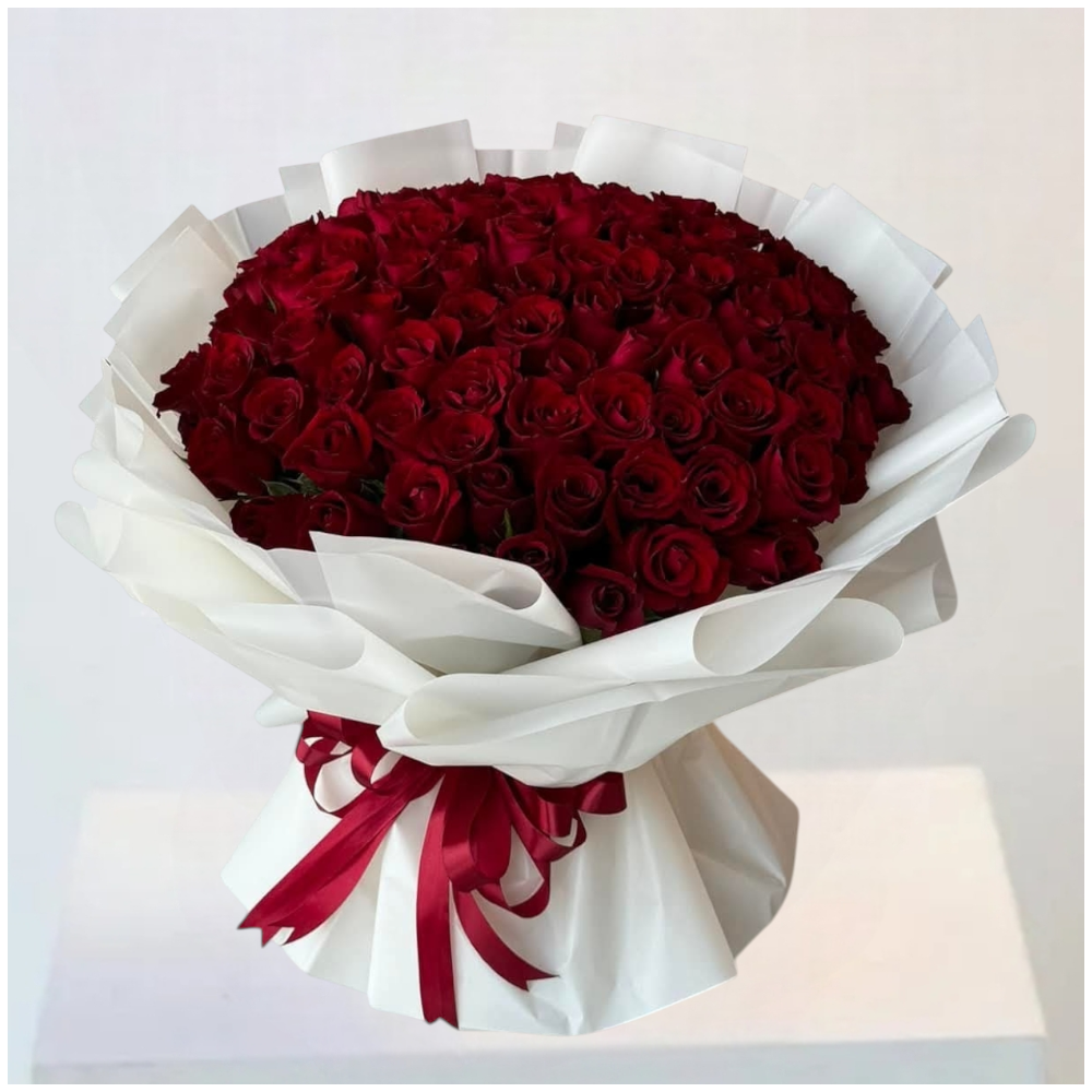 + Free Shippinga large, luxurious bouquet of numerous deep red roses. The flowers are arranged densely and wrapped in elegant white paper, giving it a sophisticated look.