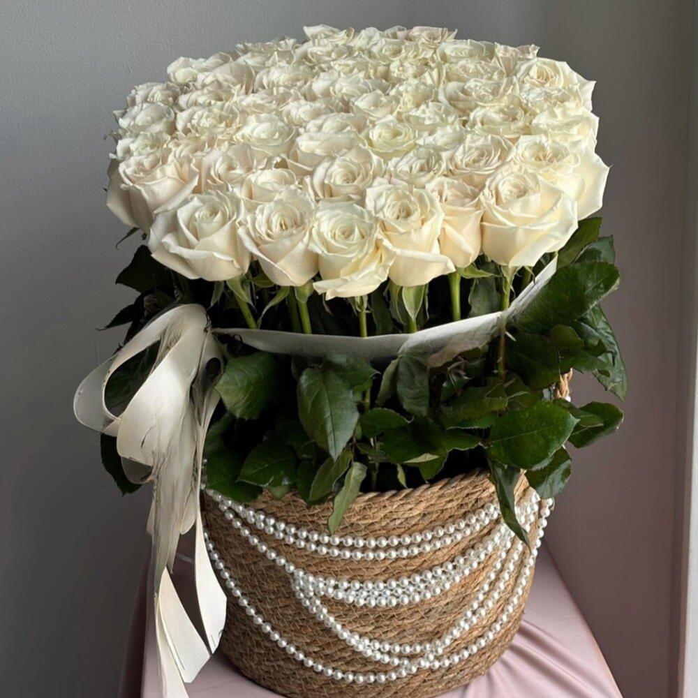 51 luxurious long stem white roses in beautiful basket with white Pearls