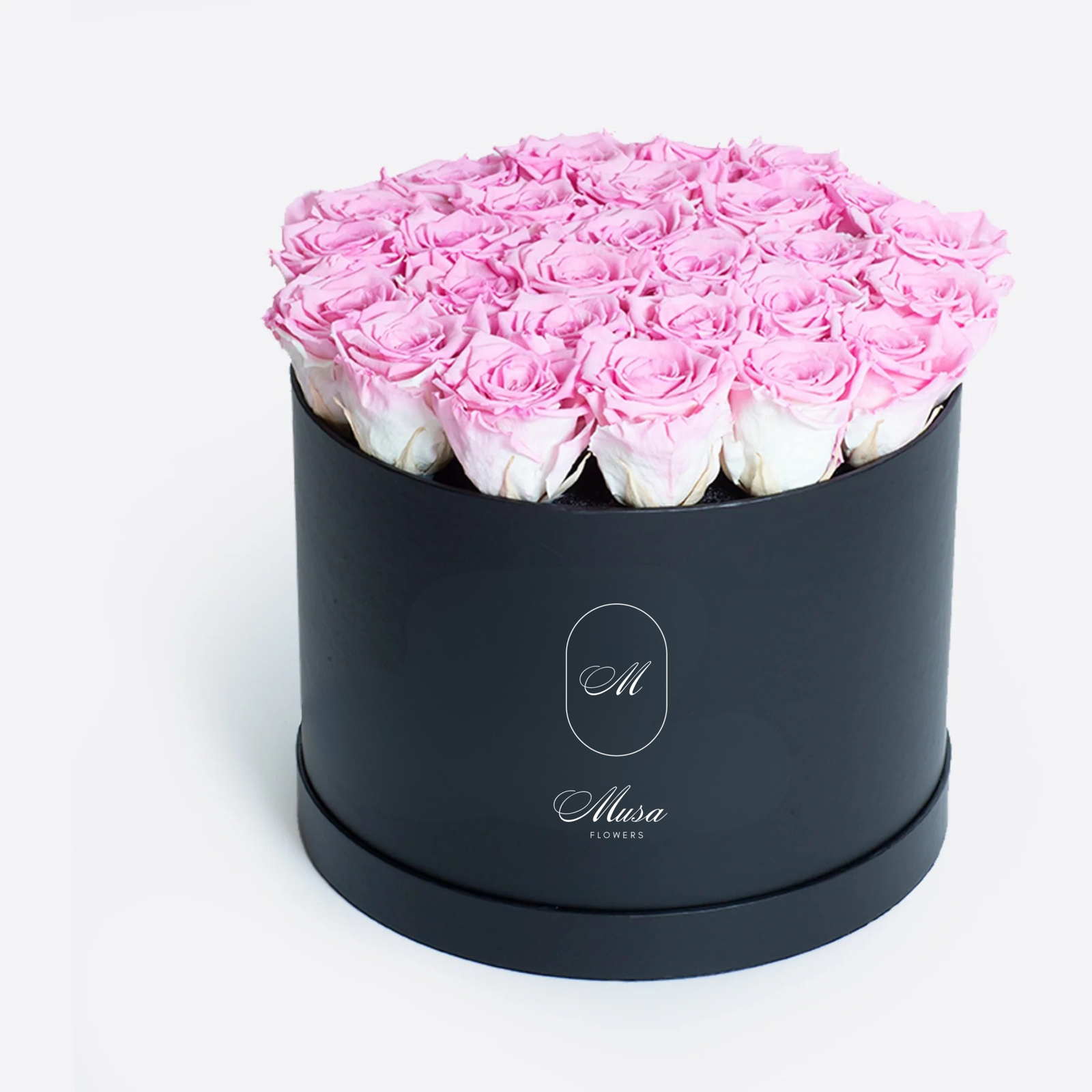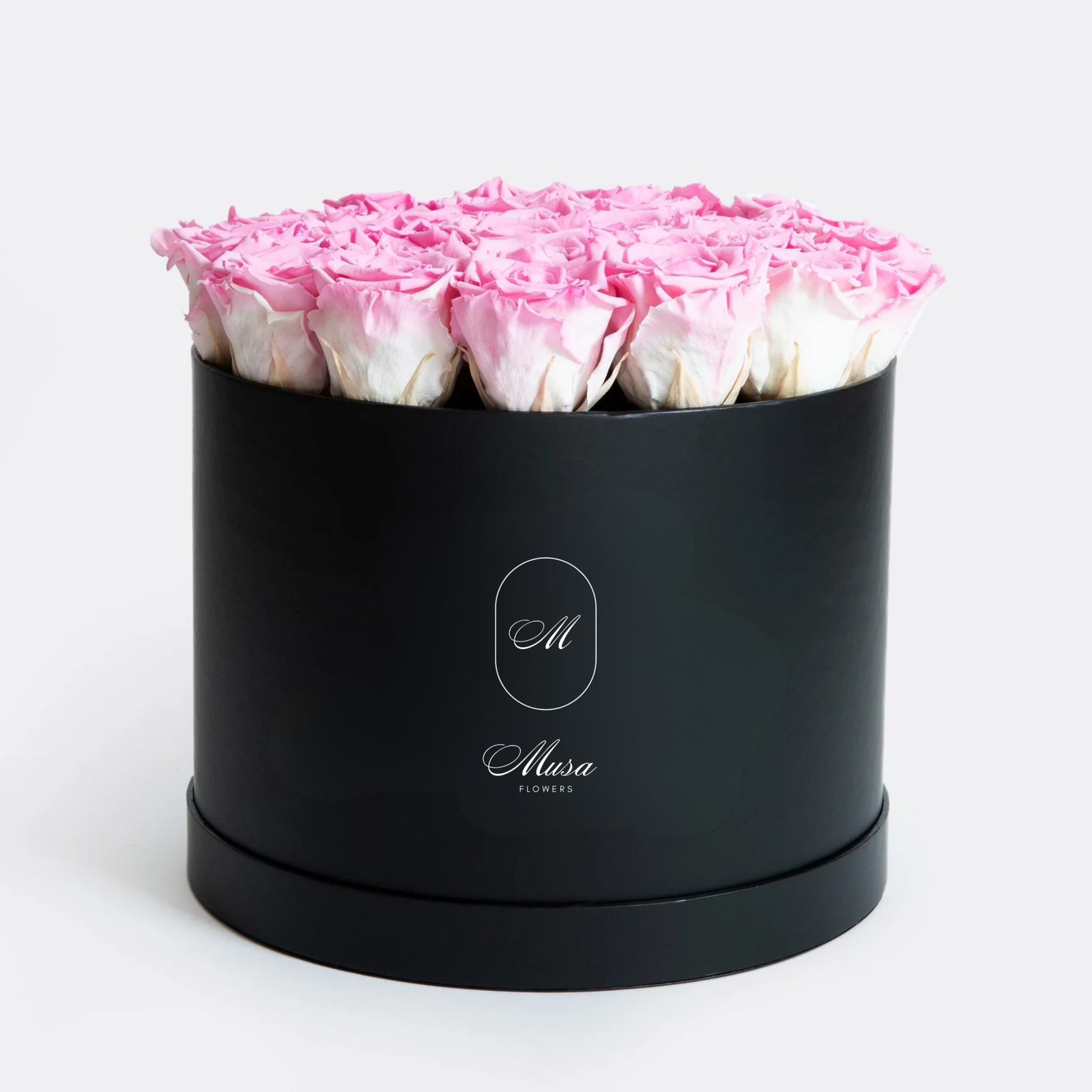 A refined blend of softness and bold elegance, this arrangement features 29 premium pink roses carefully arranged in a luxurious black box. The deep black base creates a striking contrast against the delicate blush tones of the roses, resulting in a modern, stylish, and eye-catching presentation.