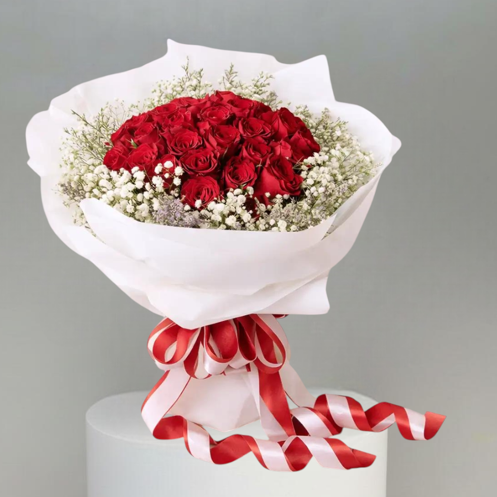 + Free ShippingThis bouquet consists of 25Â imported red roses with some gypsophila, wrapped in a modern graphic paper style. Give this timeless bouquet to your loved one to express eternal