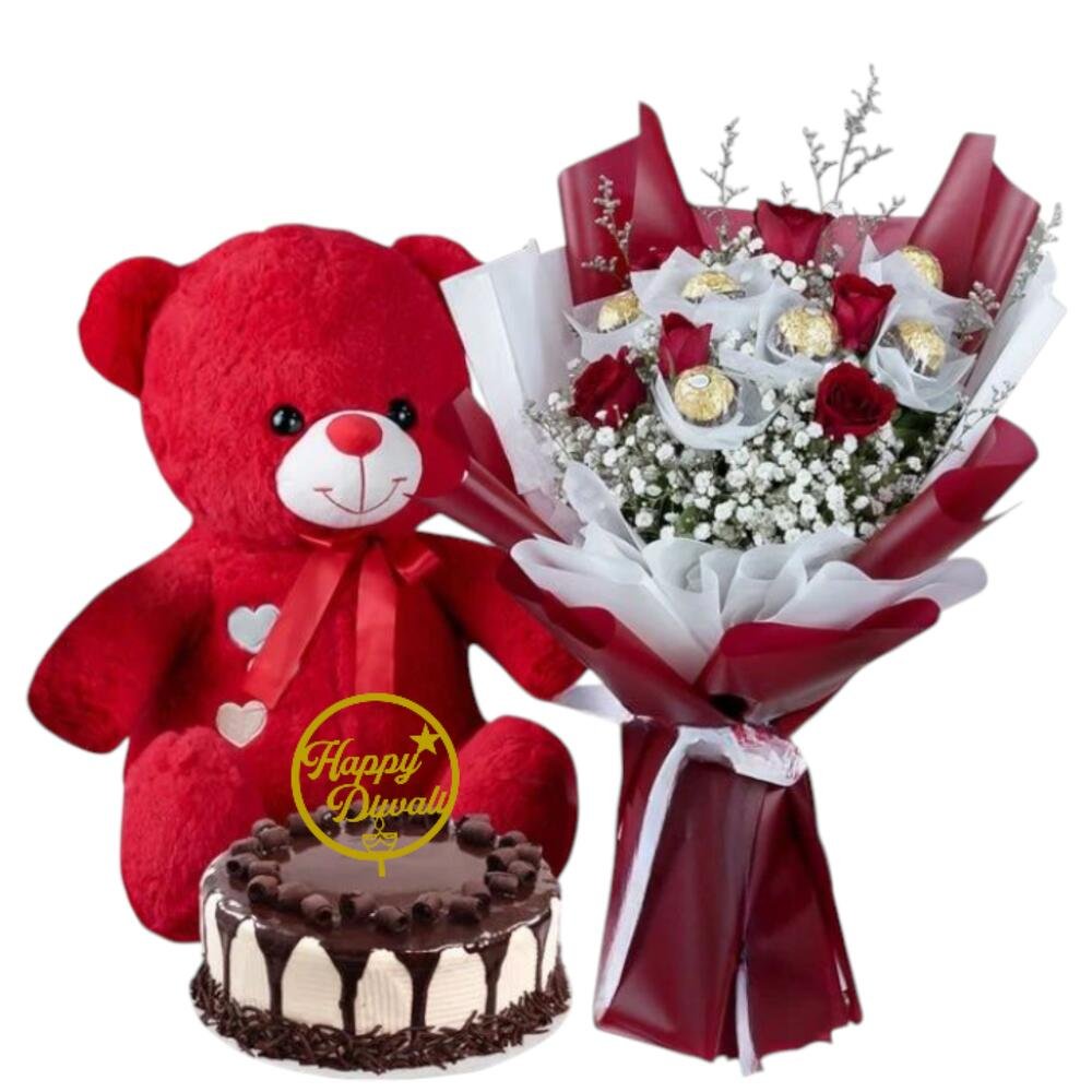 This festive combo includes a luxurious bouquet of red roses, Ferrero Rocher chocolates, and baby’s breath wrapped in elegant red white paper — paired with an adorable plush teddy and a delicious chocolate cake. Perfect for lighting up your loved ones Diwali with joy and warm