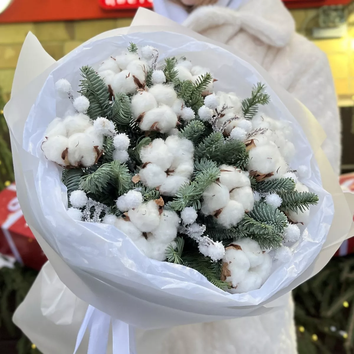 20 Greenery: Sprigs of evergreen branches, such as pine or fir, are interspersed throughout the arrangement, adding a fresh, natural contrast to the white cotton.