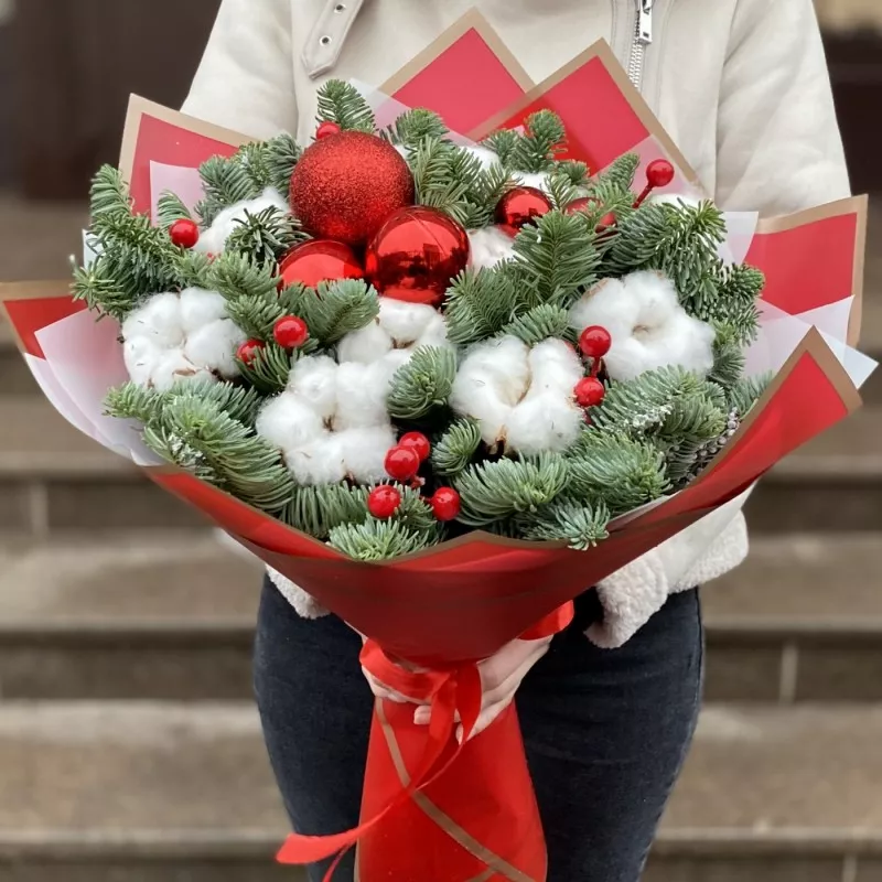4 Red ornaments: Shiny, round red baubles of various sizes are strategically placed throughout the bouquet. Red is a color of celebration and comfort.